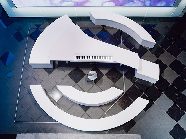 また内装面では楽器で使用される高品位な木材を多く使用。木の質感を大切にしたアコースティックな斜め格子のウッドパネルは、銀座ヤマハビルの外装のイメージをオーバーラップさせており、まるでホールという楽器の内部にいるような、音と音楽に溢れるシンボリックな空間となっています。
