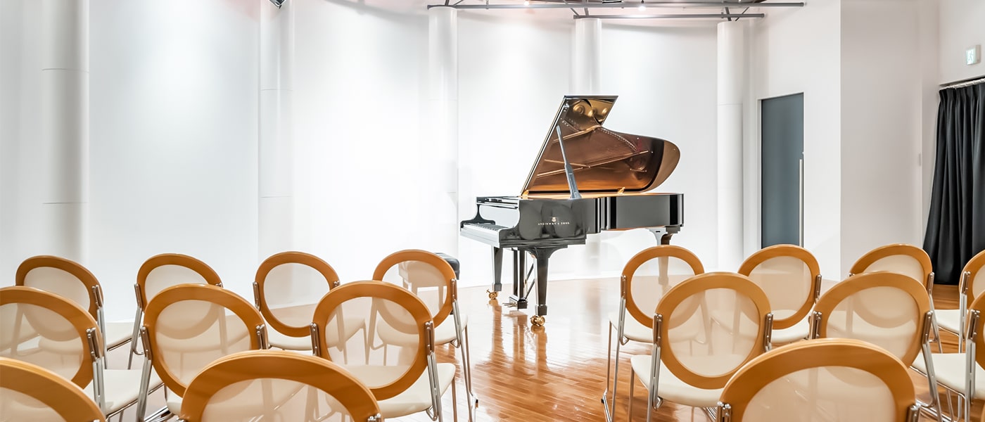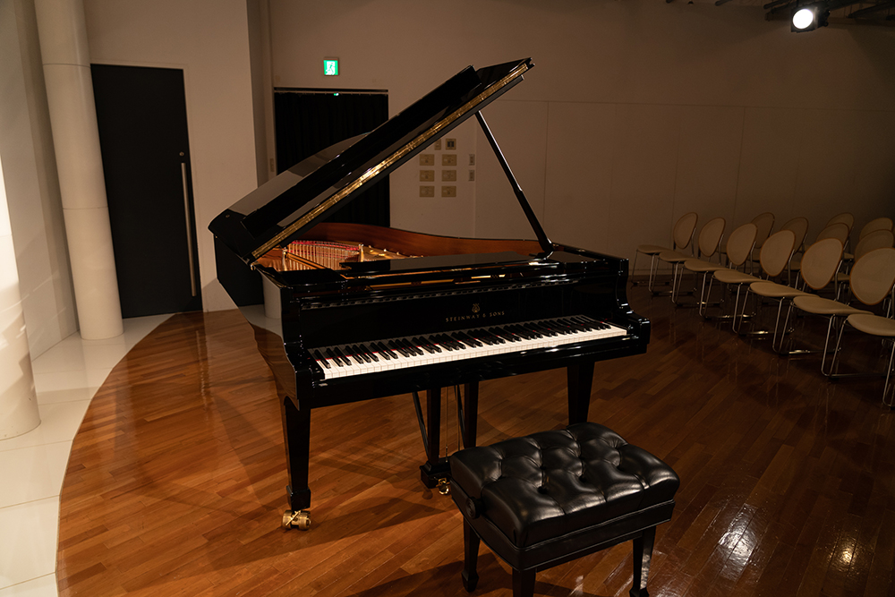 ホール内にスタインウェイB211を常設し最大客席数は83席。ガラス張りで吹き抜けのモダンなラウンジは7点の及川キーダの絵画で彩られておりコンサート後のパーティースペースとしても最適な空間。