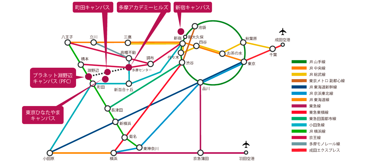 桜美林大学には、町田キャンパス、新宿キャンパス、東京ひなたやまキャンパス、プラネット淵野辺キャンパス(PFC)、千駄ヶ谷キャンパス、多摩アカデミーヒルズ(多摩キャンパス)があります。