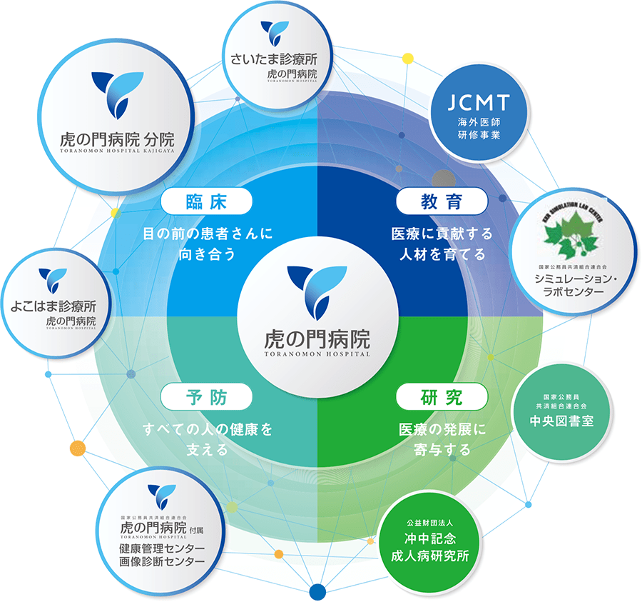 目の前の患者さんに向き合う「臨床」、すべての人々の健康を支える「予防」、医療に貢献する人材を育てる「教育」、医療の発展に寄与する「研究」。この4つの柱がそれぞれに機能することはもちろん、同時に、得たものを互いに還元し合う場としてあるべきだと当院は考えています。
