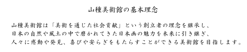 日本画は、岩絵具や和紙など自然の素材を用いる芸術です。その主題や表現においても自然の美しさや季節感などが大切にされ、自然とともに生きる中で培われてきた日本の伝統的な美意識が反映されています。山種美術館は、日本独特の自然や風土の中で、長いときをかけて磨かれてきた日本画の魅力を、年齢、性別、国籍を問わず、一人でも多くの方にお伝えしていきたいと考えています。また、日本画を未来に引き継いでいくことができるよう、様々な活動を展開してまいりたいと存じます。