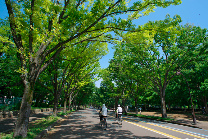 その名の通り、東京オリンピックの第2会場として、レスリングやバレーボールなどの競技が行われた場所です。大会終了後、緑と様々な体育施設を有する運動公園として開放されました。競技場が中心の公園ですが、園内を一周する約2.1kmのサイクリングコースとジョギングコースも設置。散策やジョギング、サイクリングをする近隣の人々の姿が多く見られます。