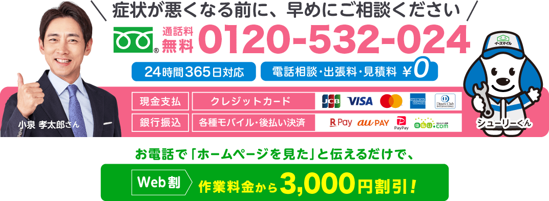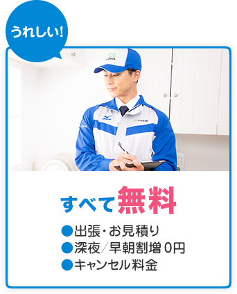 「深夜や早朝は料金が割増しになるの?」「キャンセルするとお金がかかるの?」等、お問い合せをいただきます。イースマイルは、お客様に安心してご依頼いただく為に、お見積・キャンセル料・深夜割増料金は全て無料。格安を謳い、事前見積無しで作業を始める業者は高額請求をしてくることがありますので、ご注意ください。水のトラブルは納得できる業者に依頼したいものですし、タイミングに関係なく起こってしまうものです。安心してお電話ください。