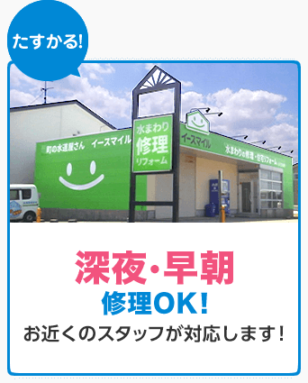 イースマイルは24時間365日年中無休で水のトラブル解決をしております。全国各地に拠点がございますのでお客様に一番近いところにいるスタッフが最短20分で駆けつけます。早朝や深夜帯でもイースマイルのサービススタッフがお伺いいたします。お伺いした際はお客様に安心していただくために名刺をお渡ししています。