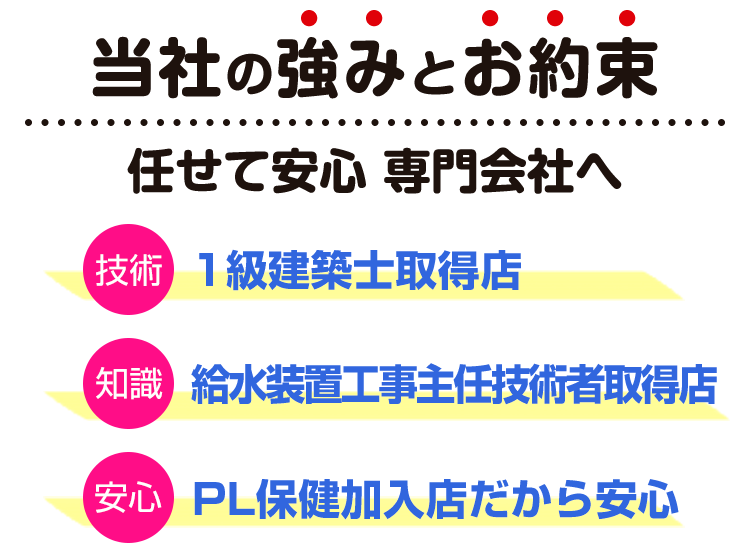 誠意を持って責任を果たす当社のプロスタッフは各種資格はもちろんのこと、サービス提供教育を受け、施工以外のお客様へのご配慮を徹底しております。当社のメリットをご確認の上、お気軽にお電話下さい。