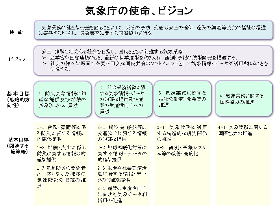 安全、強靱で活力ある社会を目指し、国民とともに前進する気象業務 産学官や国際連携のもと、最新の科学技術を取り入れ、観測・予報の技術開発を推進する。 社会の様々な場面で必要不可欠な国民共有のソフトインフラとして気象情報・データが活用されることを促進する。 |