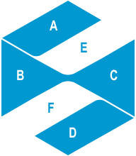 - 中央に位置するBとCは、一対となって安定と均衡を意味しており、ダイナミックに回転しながら成長する産業と貿易がバランスを保ちつつ発展する状態を表現しています。